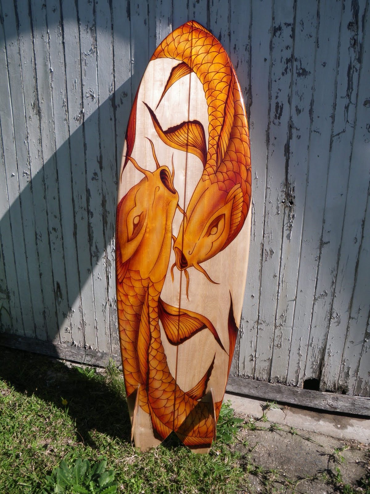 " Its a 6'4 fish, paulownia with cedar stringer and some camphour accent strips on the deck. Shane Martins had the airbrush out again and has done some beautiful koi fish on the bottom.