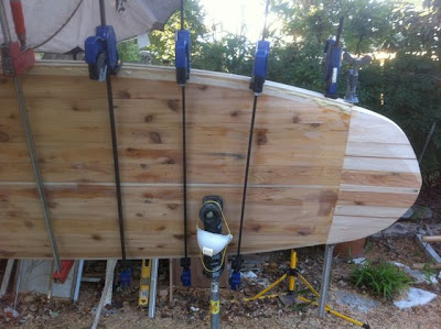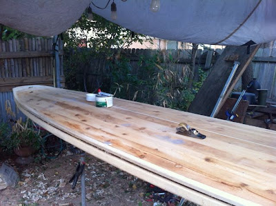 " Hi Grant, Here are a few pics of a 10'8" SUP I just laminated. The deck and bottom are made of recycled cedar fence boards from one of my landscape client's old fence. I was building them a new one of corrugated steel and bamboo, and while working on that, kept eyeballing the old boards. The owner asked us to take them away, so off they went to await their metamorphosis. Combined with Paulownia (rails, nose and tail blocks) and a bit of mahogany and redwood, it looks sweet. "