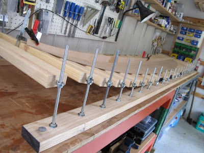 " After admiring the smooth rocker on Geoff's board at the Wooden Board Show last month I decided it was time to take control over the rocker in my boards and stop just crossing my fingers and hoping the rocker curve would still be there after everything was glued together. After a little web surfing and a few trips to Bunnings this is what I have come up with. 3m long x 650mm wide with 22 cross rails which should keep things where they are meant to be."