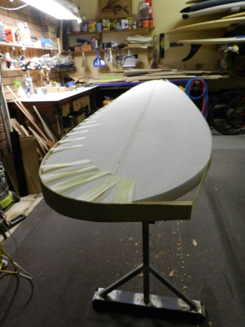 My little hand plane got quite a workout, no wonder it gets hot.All cleaned up with the rail bands foiled to the deck and bottom. Bag it up and off to the shaping bay.