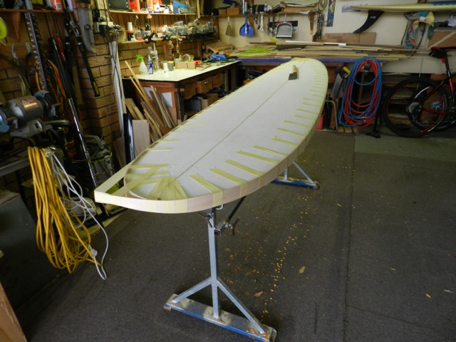 Both on and ready to trim them to the foam blank. The 3mm parabolic stingers if you like hold the rocker and when gluing the skins on encapsulates the eps in wood.