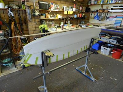 I use a 3mm scrap of Paulownia to scribe the rail band and to make it as close as possible to the shape and curve of the board. This is to save material and to keep the amount of pressure needed to bend the Paulownia around the rail shape. That way you can use masking tape and not all sorts of clamps and straps.I see people with wide strips and then struggle to get them to fit to rail.