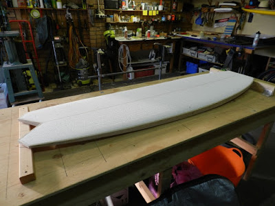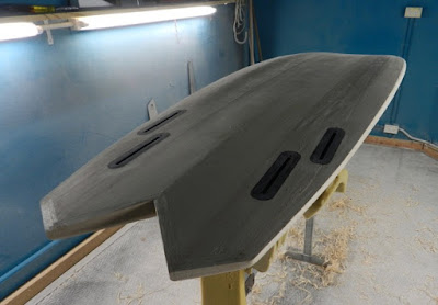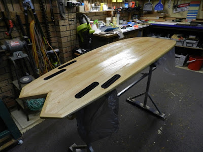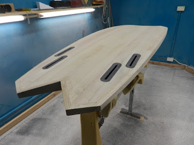 I take it to my glasser and he routes in the fin boxes and leash plug at this stage.This is the only resin in the board. Route the boxes and then paint clear resin around the inside edges to seal the grain right before using the black resin so that the black resin doesn't bleed up the grain. You get a neater finish.