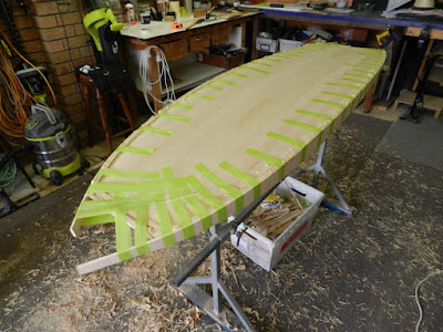 I spray a light mist of water onto the skins prior to taping them onto the EPS core. The timber can be very dry and as I said the glue is moisture activated. So a light misting will help get things foaming, and that is why you don't need lots of glue. It will only add weight and make a mess.The tape just holds the skins in place until you get it all in the bag with out moving.